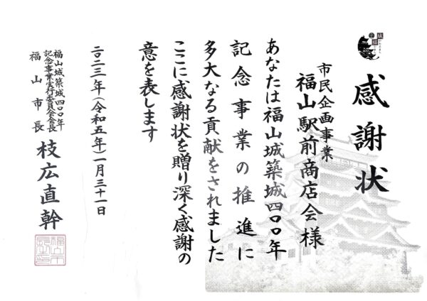 福山城の三之丸にあたるエリアに位置する福山駅前商店会は、福山城築城400年のタイミングに合わせ、築城関連の事業やイベントを多数主催してまいりました。