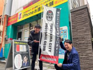 具体的には、福山駅前商店会会員さんへ、福山シティFC様のポスターやのぼりの設置協力依頼や、福山駅前商店会のWEBサイトへ応援バナーの設置です。