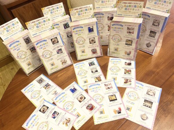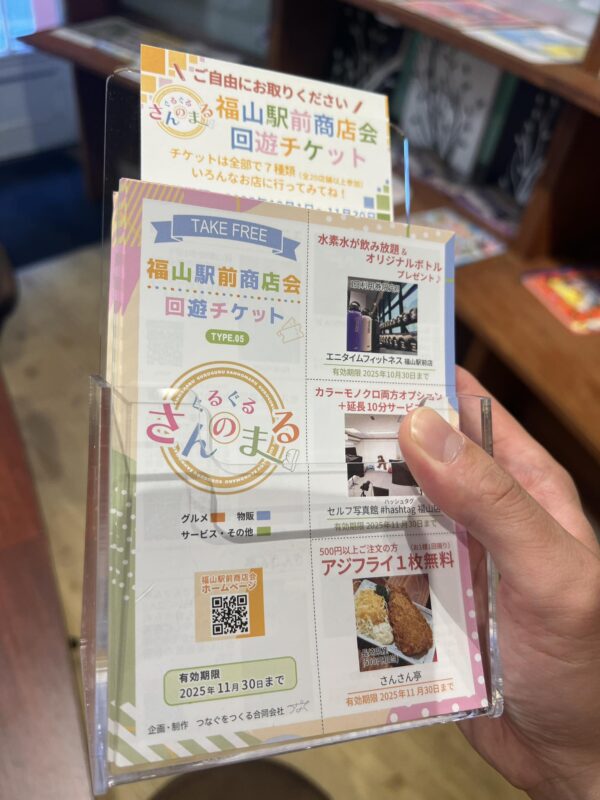 加盟店で商品やサービスをご利用いただくと、福山駅前商店会の別の店舗で使えるクーポンをお渡しします。